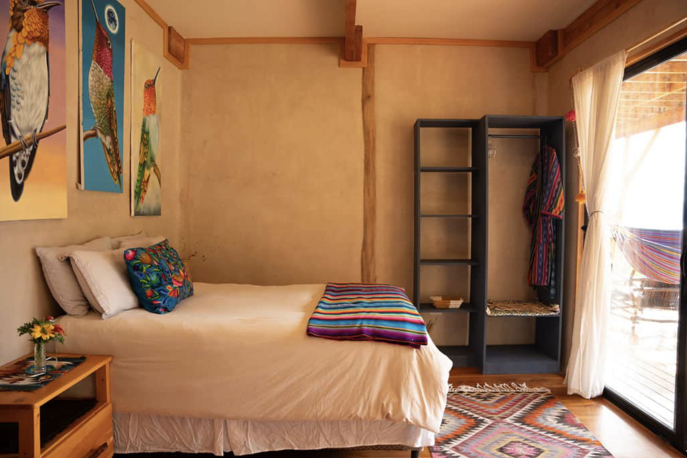 The Colibri Suite is the most spacious room, with a queen bed and wooden bunkbeds, a private bathroom and a large outdoor deck with views of the lake, volcanoes, and garden. it shares a large kitchen and two showers with Fuego and Agua.